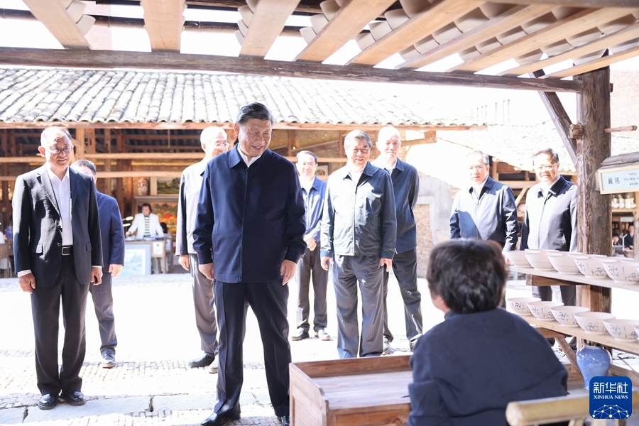10月10日至13日,中共中央总书记、国家主席、中央军委主席习近平在江西考察。这是11日上午,习近平在景德镇市陶阳里历史文化街区考察时,同非遗传承人亲切交流。新华社记者 刘彬 摄