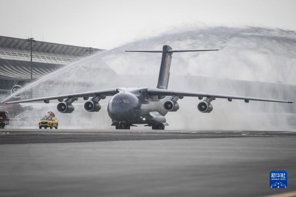 11月23日,在沈阳桃仙国际机场,运送志愿军烈士遗骸的空军专机通过水门。