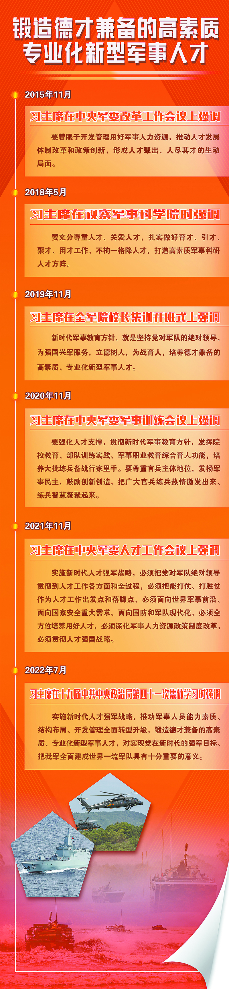 2020年,中央军委印发《关于加快推进三位一体新型军事人才培养体系建设的决定》。这一体系体现了军队院校教育、部队训练实践、军事职业教育各自的特色优势,旨在建成全员全时全域的新型军事人才培养格局。