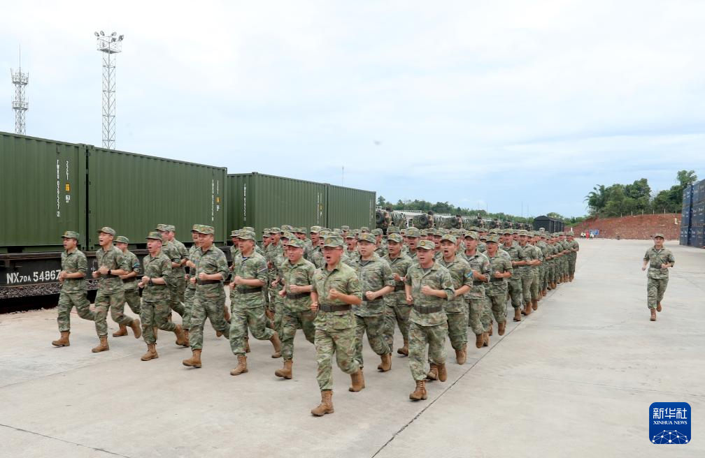 7月1日,在老挝蓬洪火车站,陆上参演分队抵达联演地域后展开集结。新华社发(易定摄)