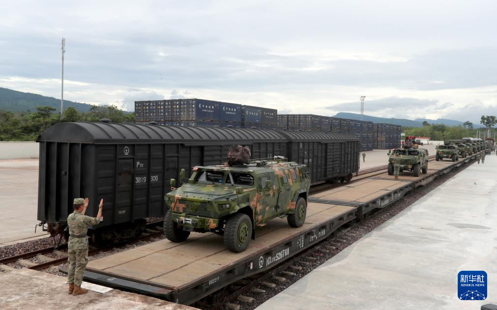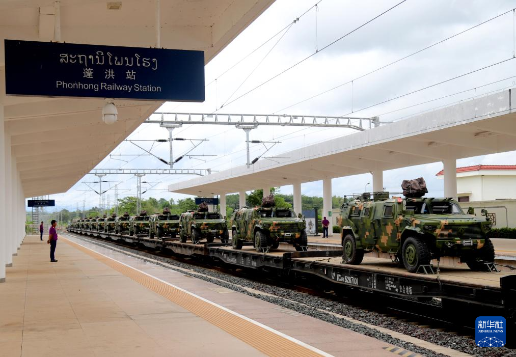 7月1日,在老挝蓬洪火车站,参演装备抵达集结地域。新华社发(孟垂云摄)