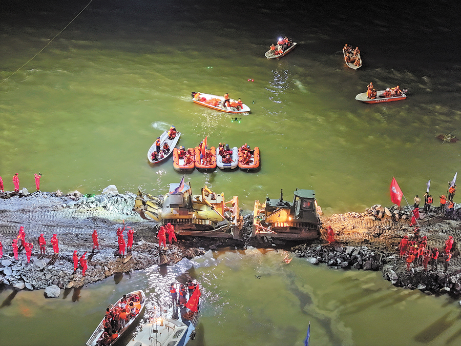 7月8日22时31分,团洲垸洞庭湖大堤决口完成封堵。新华社记者 陈思汗摄