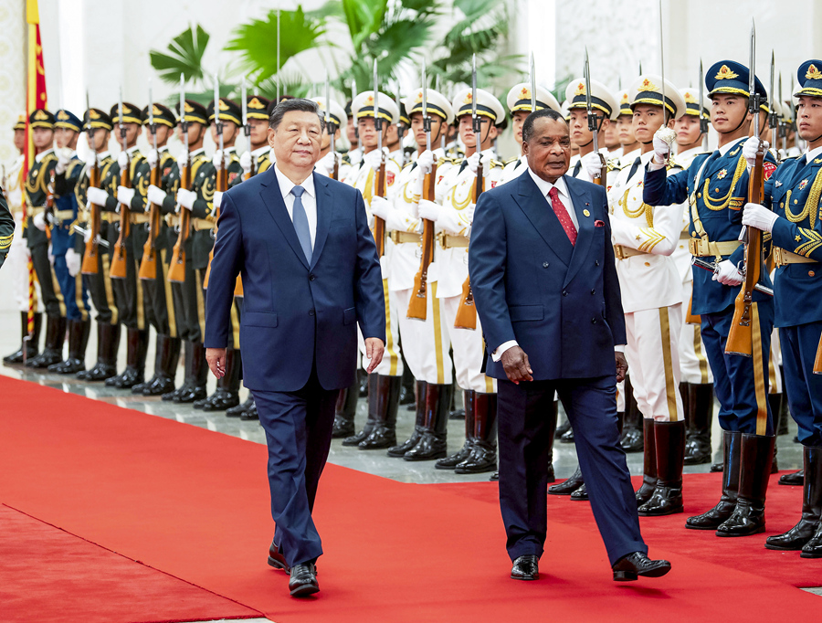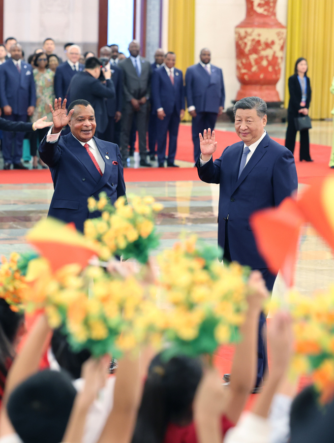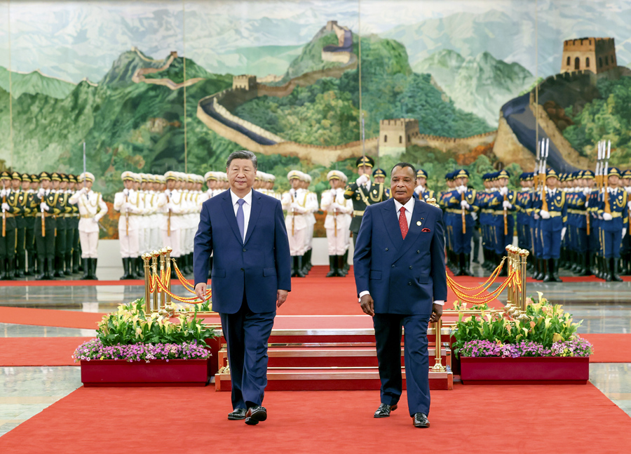 9月6日上午,国家主席习近平在北京人民大会堂同来华出席中非合作论坛北京峰会并进行国事访问的刚果(布)总统萨苏举行会谈。这是会谈前,习近平在人民大会堂北大厅为萨苏举行欢迎仪式。新华社记者 姚大伟 摄