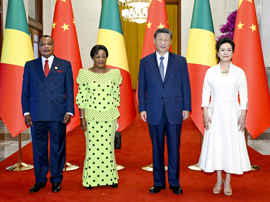 9月6日上午,国家主席习近平在北京人民大会堂同来华出席中非合作论坛北京峰会并进行国事访问的刚果(布)总统萨苏举行会谈。会谈前,习近平和夫人彭丽媛在人民大会堂北大厅为萨苏和夫人安托瓦内特举行欢迎仪式。这是习近平和彭丽媛同萨苏和安托瓦内特合影。新华社记者 李学仁 摄
