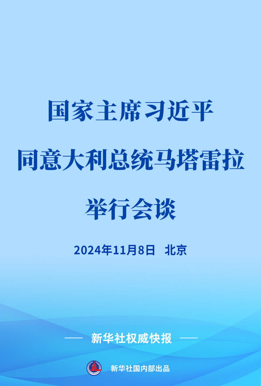 11月8日下午,国家主席习近平在北京人民大会堂同来华进行国事访问的意大利总统马塔雷拉举行会谈。