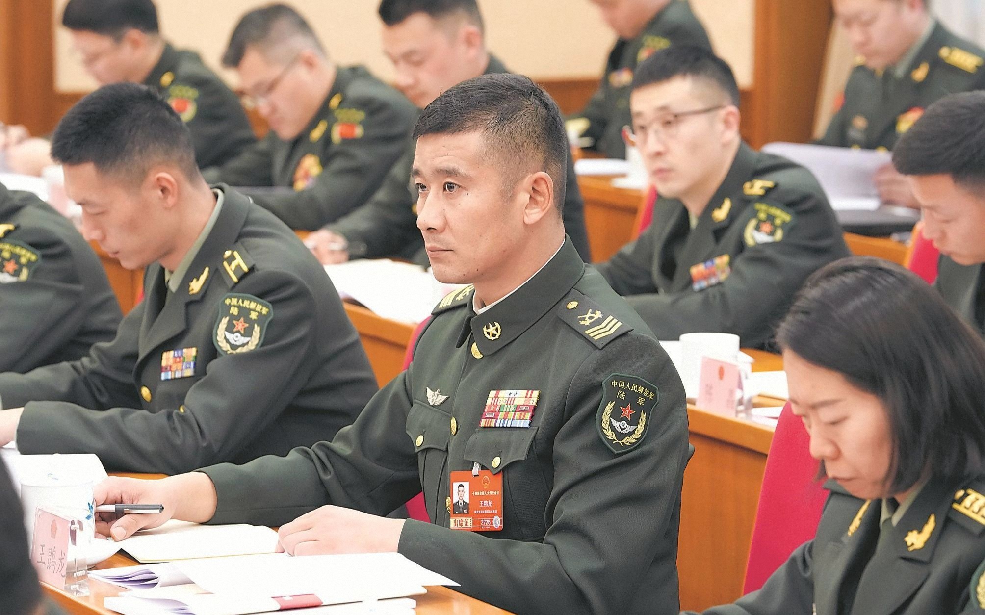 3月5日下午,解放军和武警部队代表团分组审议政府工作报告。图为军队人大代表认真听取发言。解放军报记者 范显海 摄