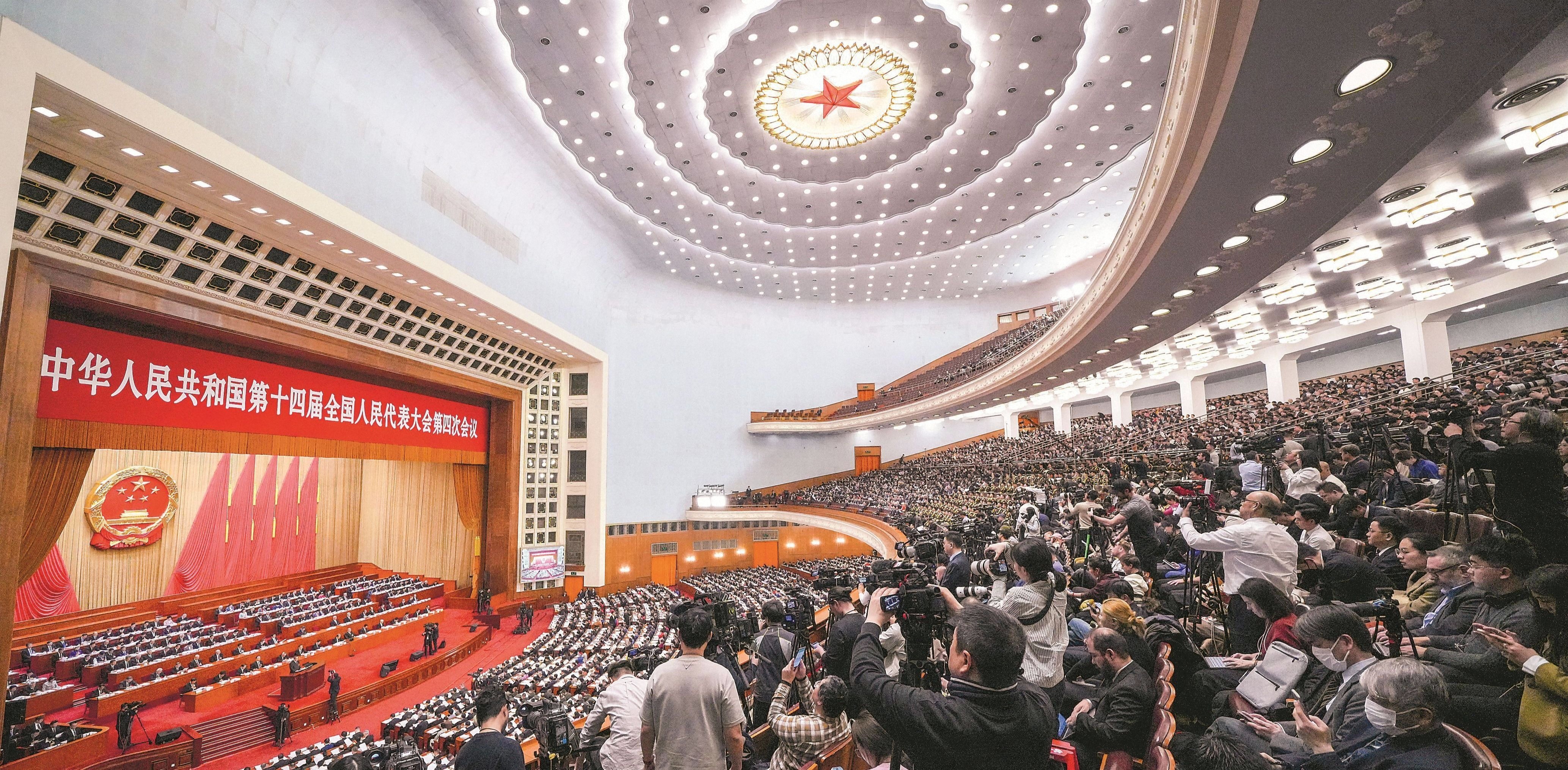 三月五日,十四届全国人大四次会议在北京人民大会堂开幕。图为大会会场。解放军报记者 王俊 摄