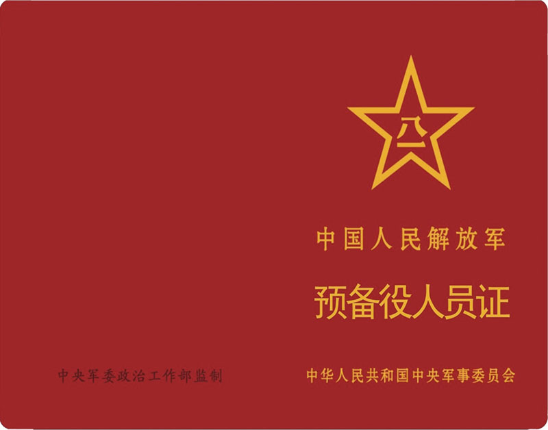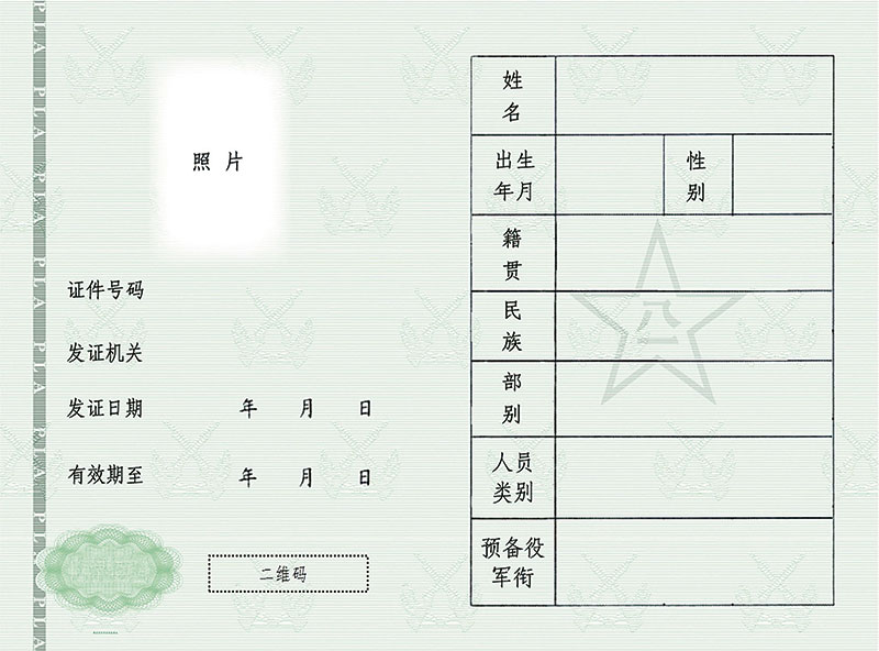 《预备役人员证》为本芯证件式样,具有较高的防伪性和通识度,是证明预备役人员身份的有效证件,证件号码为系统生成的唯一身份号码,发给《中华人民共和国预备役人员法》颁布施行后,在中国人民解放军依法服预备役的预备役军官、预备役军士和预备役兵。《中国人民解放军预备役军官证》即行废止。