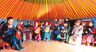 2017年11月23日,苏尼特右旗乌兰牧骑队员在桑宝拉格苏木额尔登塔拉嘎查为牧民表演文艺节目。乌兰牧骑,蒙古语意为“红色的嫩芽”,后被引申为“红色文艺轻骑兵”,是适应草原上地广人稀特点而诞生的文化工作队。