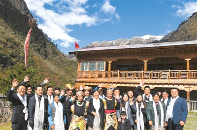 2017年10月29日,卓嘎、央宗姐妹和玉麦乡干部群众合影。隶属西藏山南市隆子县的玉麦乡位于中印边境,是中国人口最少的行政乡,全乡9户32人,农牧民党员9名。