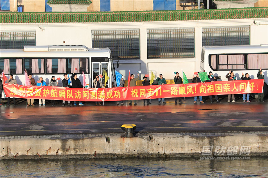 上午9时许,中国驻阿尔及利亚大使杨广玉、武官潘涛率领使馆人员、中资机构、华人华侨代表及阿方联络官到码头为官兵送行,编队指挥员黄凤志、政委何如胜与送行人员握手话别。