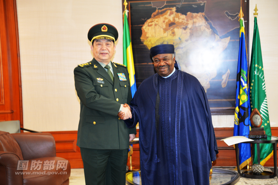 2月23日下午,加蓬总统阿里·邦戈在总统府会见了到访的国务委员兼国防部长常万全。