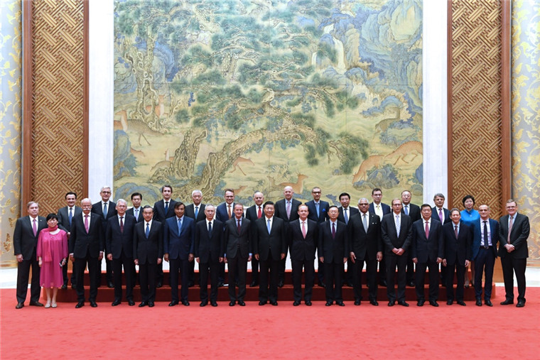 6月21日,国家主席习近平在北京钓鱼台国宾馆会见来华出席“全球首席执行官委员会”特别圆桌峰会的知名跨国企业负责人,并同他们座谈交流。新华社记者 饶爱民 摄