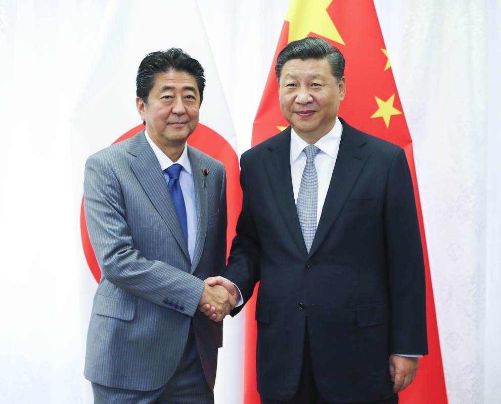 9月12日,国家主席习近平在符拉迪沃斯托克会见日本首相安倍晋三。新华社记者 谢环驰 摄