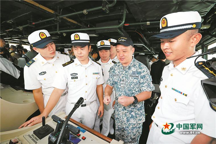 在黄山舰上,新加坡海军官兵仔细聆听引导员讲解各型武器装备。从飞行甲板的设置,到损管器材的应用,都成为双方交流的话题。“我父母年轻的时候从中国移民至新加坡。”一位姓李的华裔新加坡海军新兵表示,再次回到中国,看到先进的舰艇,觉得很开心。