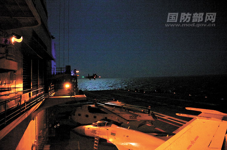 歼-15舰载战斗机进行夜间阻拦着舰训练。胡善敏 摄