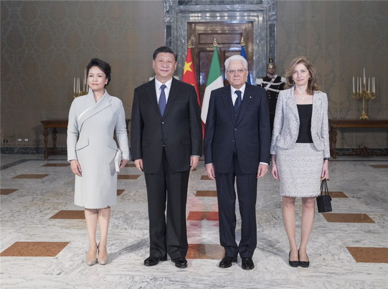 3月22日,国家主席习近平在罗马同意大利总统马塔雷拉举行会谈。会谈前,马塔雷拉总统为习近平举行隆重欢迎仪式。这是习近平和夫人彭丽媛同马塔雷拉总统和女儿劳拉合影。新华社记者 王晔 摄