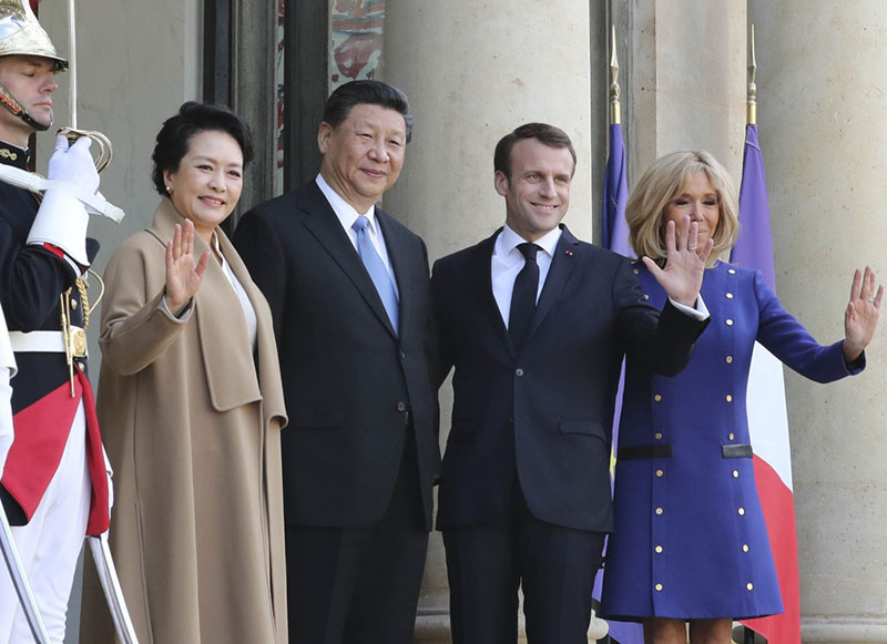 当地时间下午5时许,习近平和彭丽媛抵达爱丽舍宫,马克龙夫妇在下车处热情迎接。法兰西共和国卫队海陆空军仪仗队戎装列队,军乐团奏起欢快的乐曲。习近平和彭丽媛同马克龙夫妇亲切话别,合影留念。