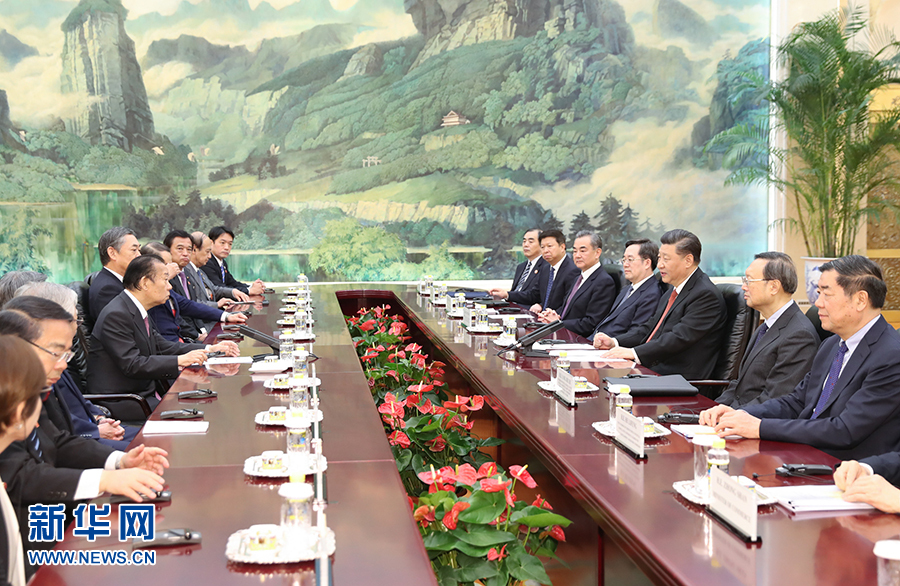 习近平指出,当前,中日关系重回正常轨道,呈现积极发展势头。双方要恪守中日四个政治文件确立的各项原则,坚持和平友好大方向,持续深化互利合作,推动两国关系健康稳定发展。要把中日“互不构成威胁”、“互为合作伙伴,相互支持对方和平发展”的政治共识落到实处,把两国各领域交流合作推向新水平。双方要深挖合作潜力。中方欢迎日方继续深入参与中国改革开放,希望日方更加积极参与共建“一带一路”。双方要加强沟通和协调,共同维护多边主义和自由贸易,共同推动建设开放型世界经济。中方支持日方办好二十国集团领导人大阪峰会。今年是中日青少年交流促进年,双方要在两国民间特别是青少年当中广泛播撒友好种子,推进民心相通。