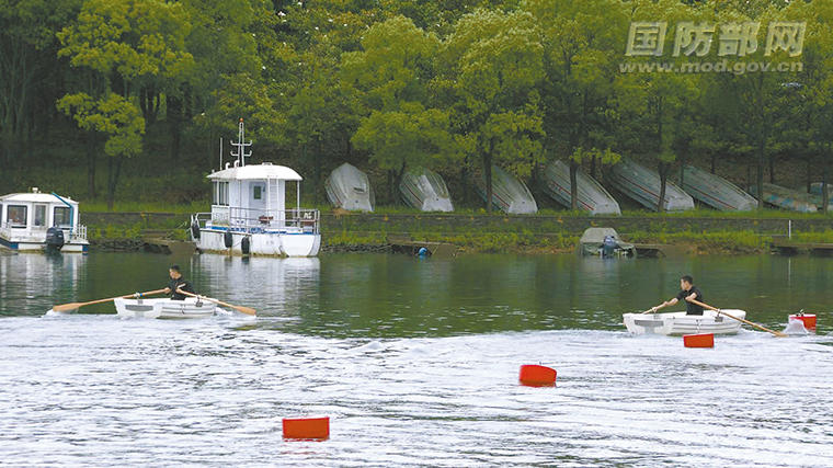 在航海技术的比赛中,运动员需要划舢板在近300米的赛道上绕过浮标。比赛中要求运动员划两个来回。在日常训练中,海军五项队的队员们每天都要进行6至7趟划行,高强度的训练保证队员在比赛中能够更好地发挥自己的水平。