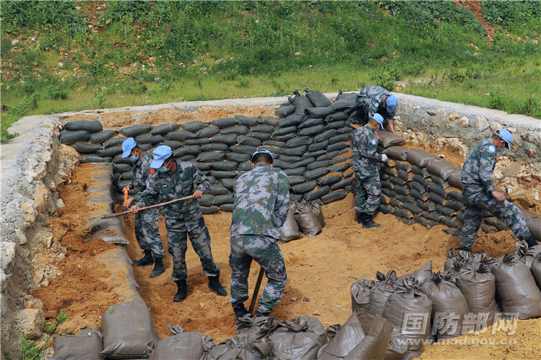 施工现场,每个销毁坑由12名作业人员协同配合,一锹一镐填装沙袋、填补间隙、夯实沙墙墙体。官兵卖力施工,不惧疲惫,施工小组长宁增不时鼓舞士气:“每一次高标准的施工、及时的完成任务,都是在国际舞台展现中国力量!”