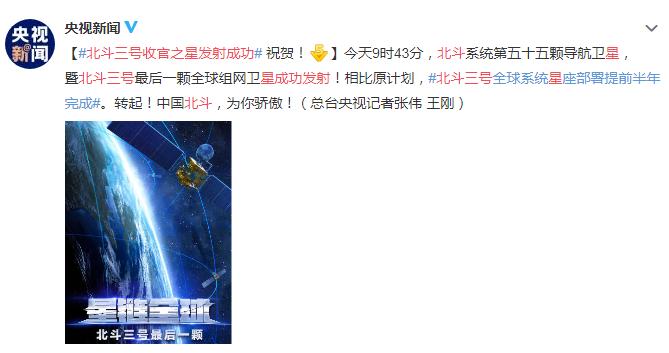 今天9时43分,北斗系统第五十五颗导航卫星,暨北斗三号最后一颗全球组网卫星成功发射!相比原计划,北斗三号全球系统星座部署提前半年完成。中国北斗,为你骄傲!(总台央视记者张伟 王刚)