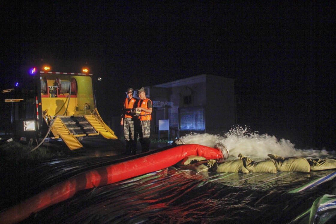 7月13日,在湖北省石首市沙滩子故道,武警第二机动总队某支队官兵利用大型龙吸水装备连夜进行排涝作业。新华社发(岳小东 摄)