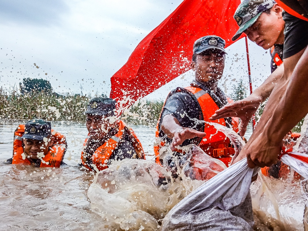 “危险!我上!”面对被洪水冲走的风险,东部战区空军某部50名骨干跳入没过胸口的水中,用血肉之躯封堵管涌点。7个小时连续奋战,一条80米长、1.5米深的砂石圈在50名官兵的身后筑起。