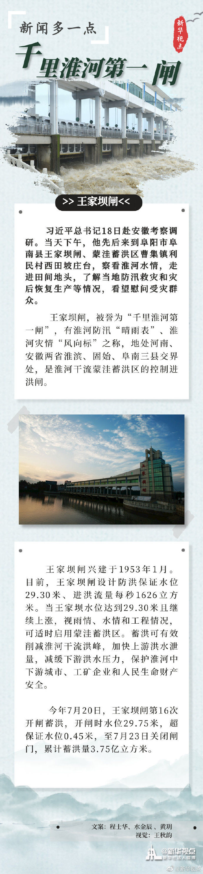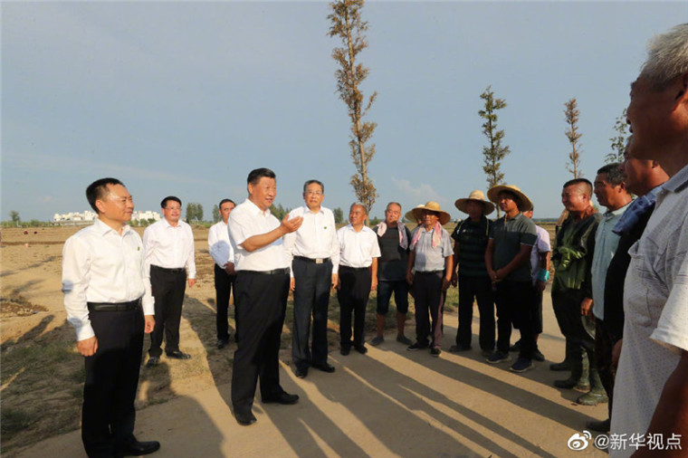 习近平总书记18日赴安徽考察调研。当天下午,他先后来到阜阳市阜南县王家坝闸、红亮箱包有限公司、蒙洼蓄洪区曹集镇利民村西田坡庄台,察看淮河水情,走进田间地头,了解当地防汛救灾和灾后恢复生产等情况,看望慰问受灾群众。(文字记者:张晓松 摄影记者:鞠鹏 王晔)