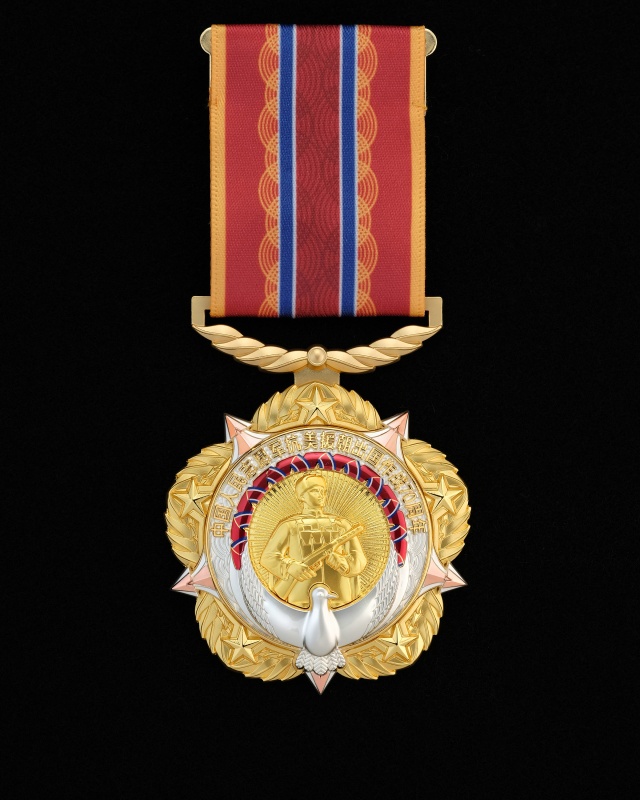 纪念章使用紫铜胎镀金、银材质,通径为50毫米。纪念章核心部分为志愿军战士形象和70束光芒,以和平鸽、水纹和中朝两国国旗元素编制的绶带环绕四周,外围采用五星、桂叶和象征五次战役的箭头等元素,组成金达莱花的五瓣造型,象征中国人民志愿军抗美援朝出国作战70周年,寓意伟大的抗美援朝战争是保卫和平、反抗侵略的正义之战,伟大的抗美援朝精神永远是中国人民的宝贵财富,彰显了我国不畏强敌、维护世界和平、构建人类命运共同体的坚定决心和信心。