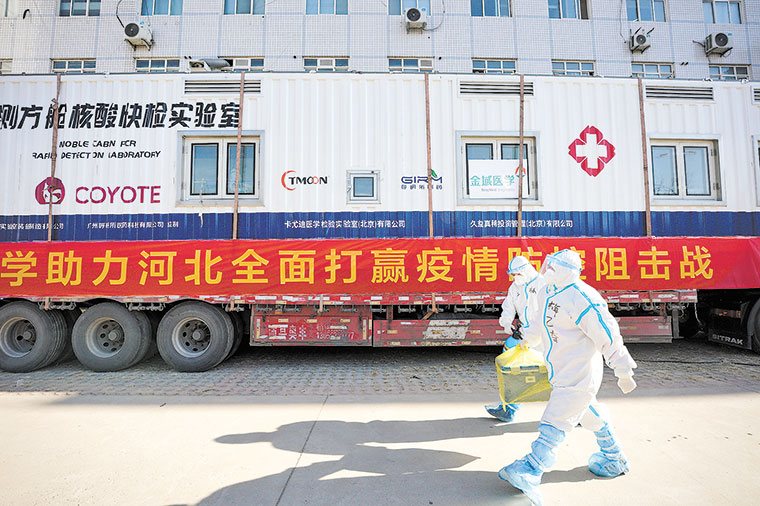 1月8日,从武汉来石家庄支援抗疫的“核酸样本快递员”梅乙奇(前)在运送装有核酸样本的运输箱。新华社发
