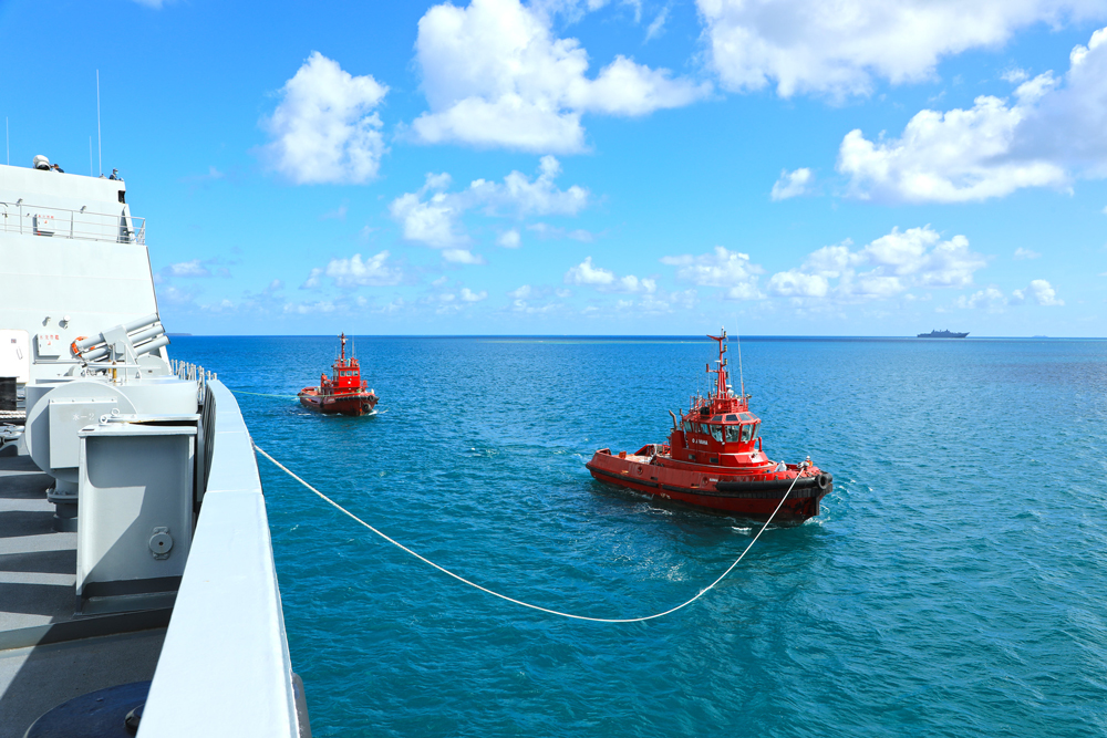 2月15日,赴汤加执行运送救灾物资任务的中国海军舰艇编队抵达汤加努库阿洛法港,汤方拖船协助我方军舰靠泊。