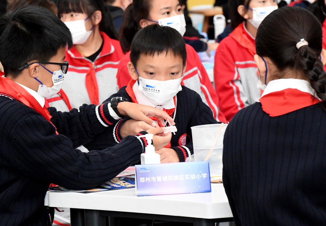 10月12日,学生在河南省科技馆收看“天宫课堂”第三课时做实验。 新华社记者 李安 摄