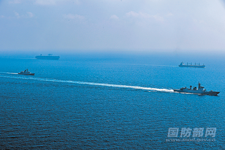 中国海军第42批护航编队正在护送商船。解放军报特约通讯员 马玉彬摄