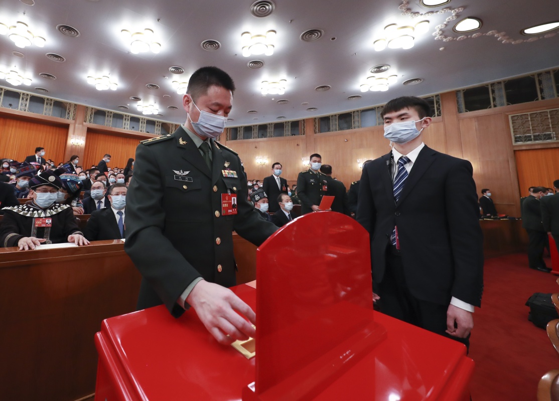 3月10日,十四届全国人大一次会议在北京人民大会堂举行第三次全体会议。这是代表在投票。新华社记者 丁林 摄