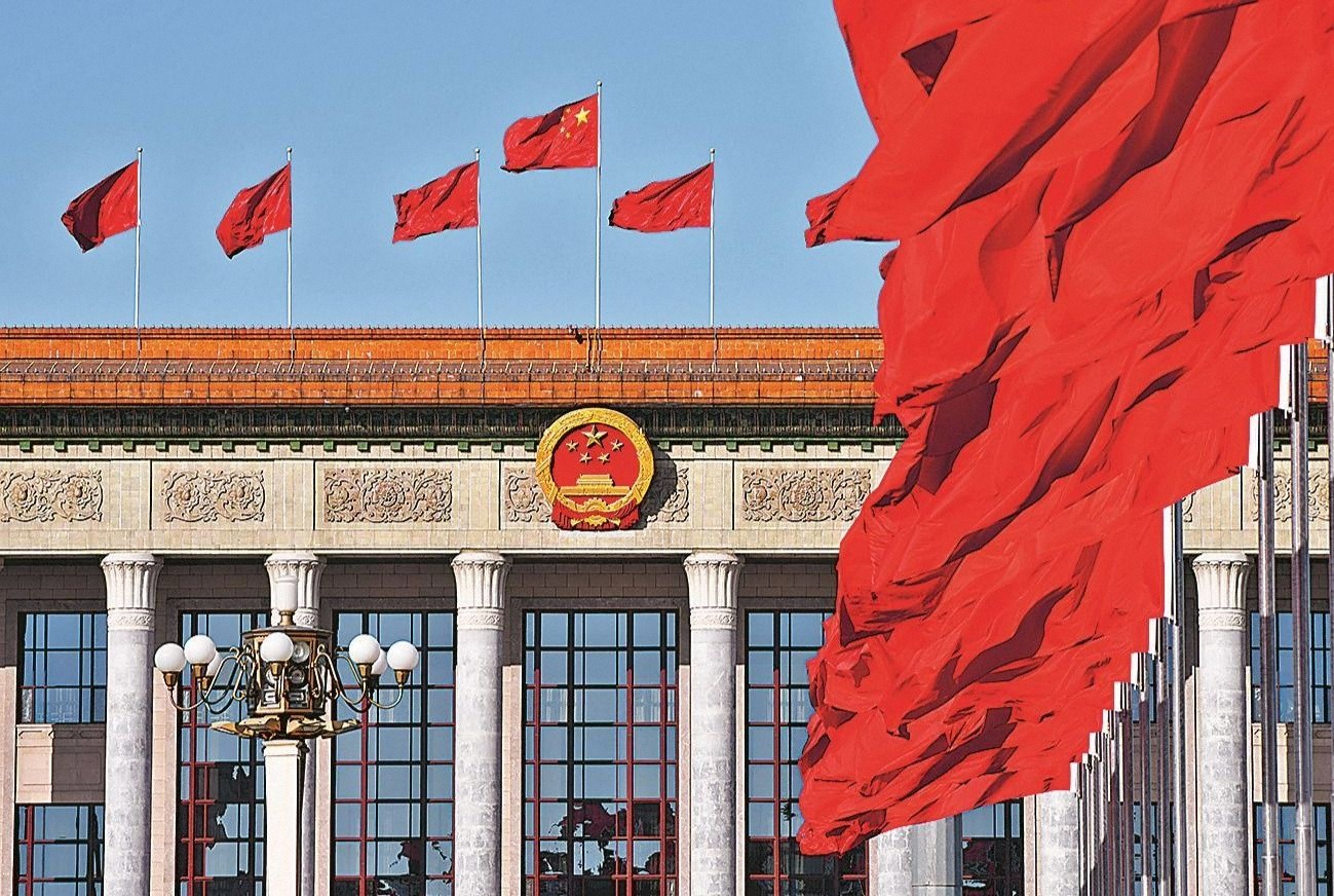 人民大会堂东门外广场上,红旗迎风招展。解放军报记者 刘妍 摄