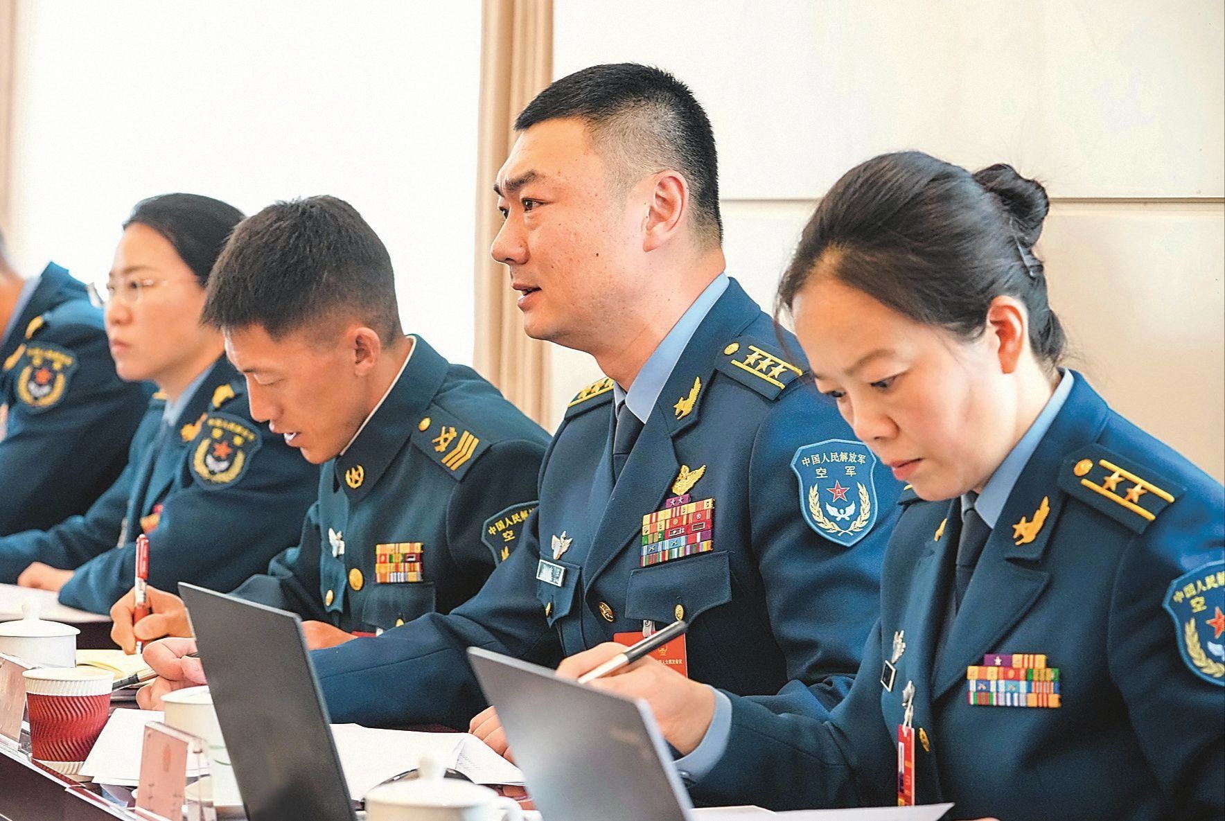 3月10日上午,解放军和武警部队代表团举行小组会议。图为军队人大代表发言。解放军报记者 范显海 摄