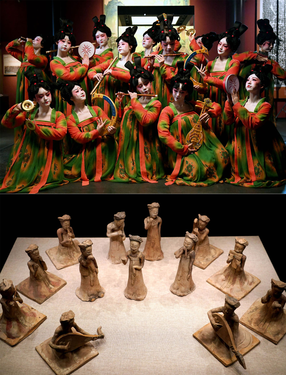 这是一张拼版照片:上图为郑州歌舞剧院的演员在录制河南博物院元宵奇妙夜节目(2021年2月20日摄);下图为河南博物院主展馆内展出的展品(2020年9月24日摄)。新华社记者 李安 摄