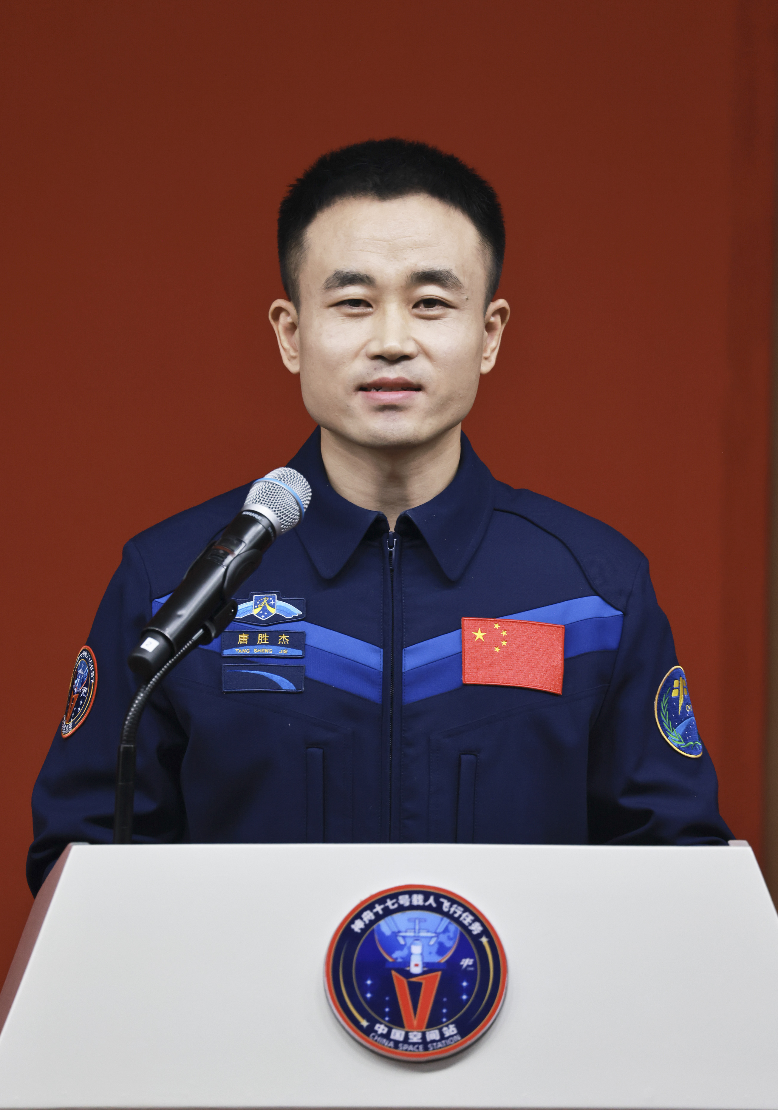 10月25日上午,神舟十七号载人飞行任务航天员汤洪波、唐胜杰、江新林在酒泉卫星发射中心问天阁与中外媒体记者集体见面。这是航天员唐胜杰与中外媒体记者见面。新华社记者 李刚 摄