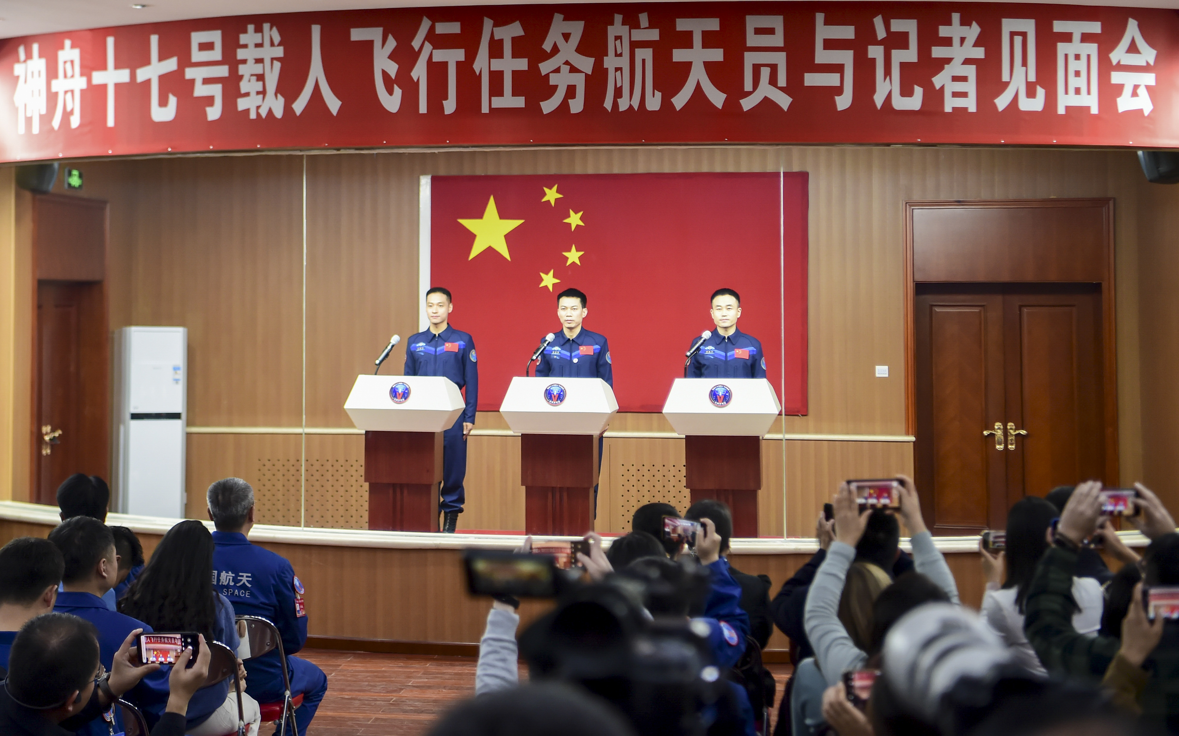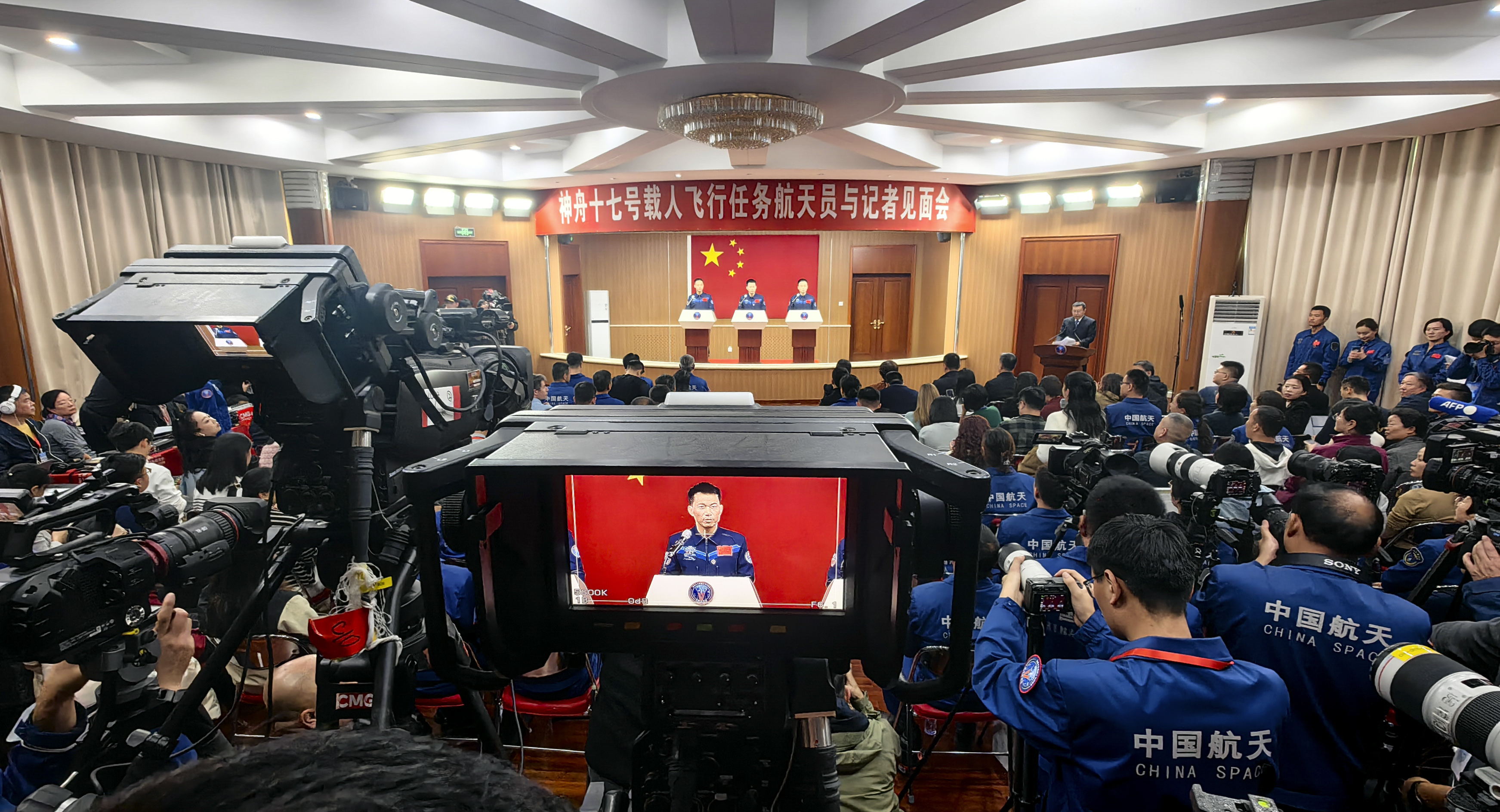 10月25日上午,神舟十七号载人飞行任务航天员汤洪波(中)、唐胜杰(右)、江新林在酒泉卫星发射中心问天阁与中外媒体记者集体见面。新华社记者 李刚 摄