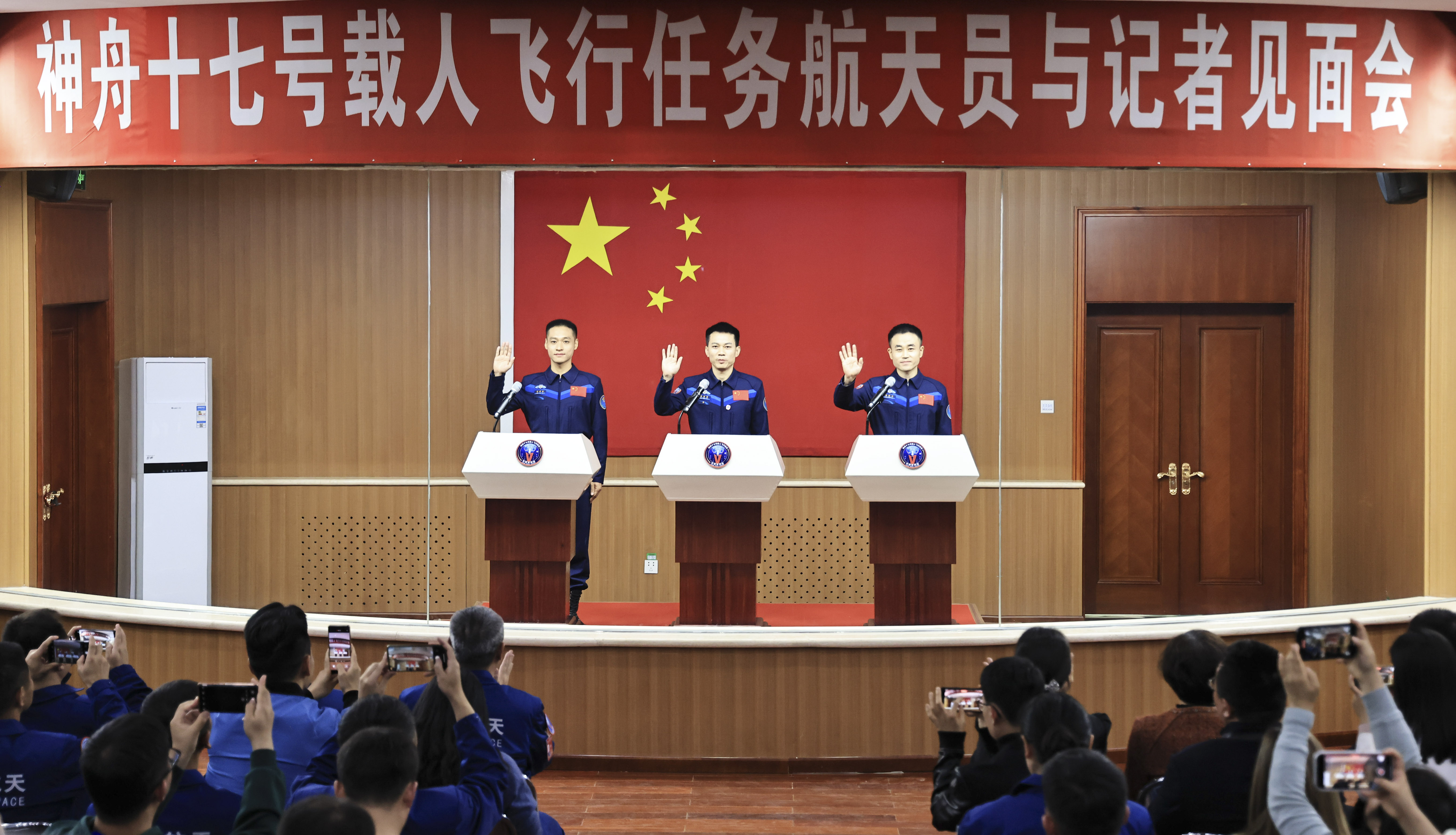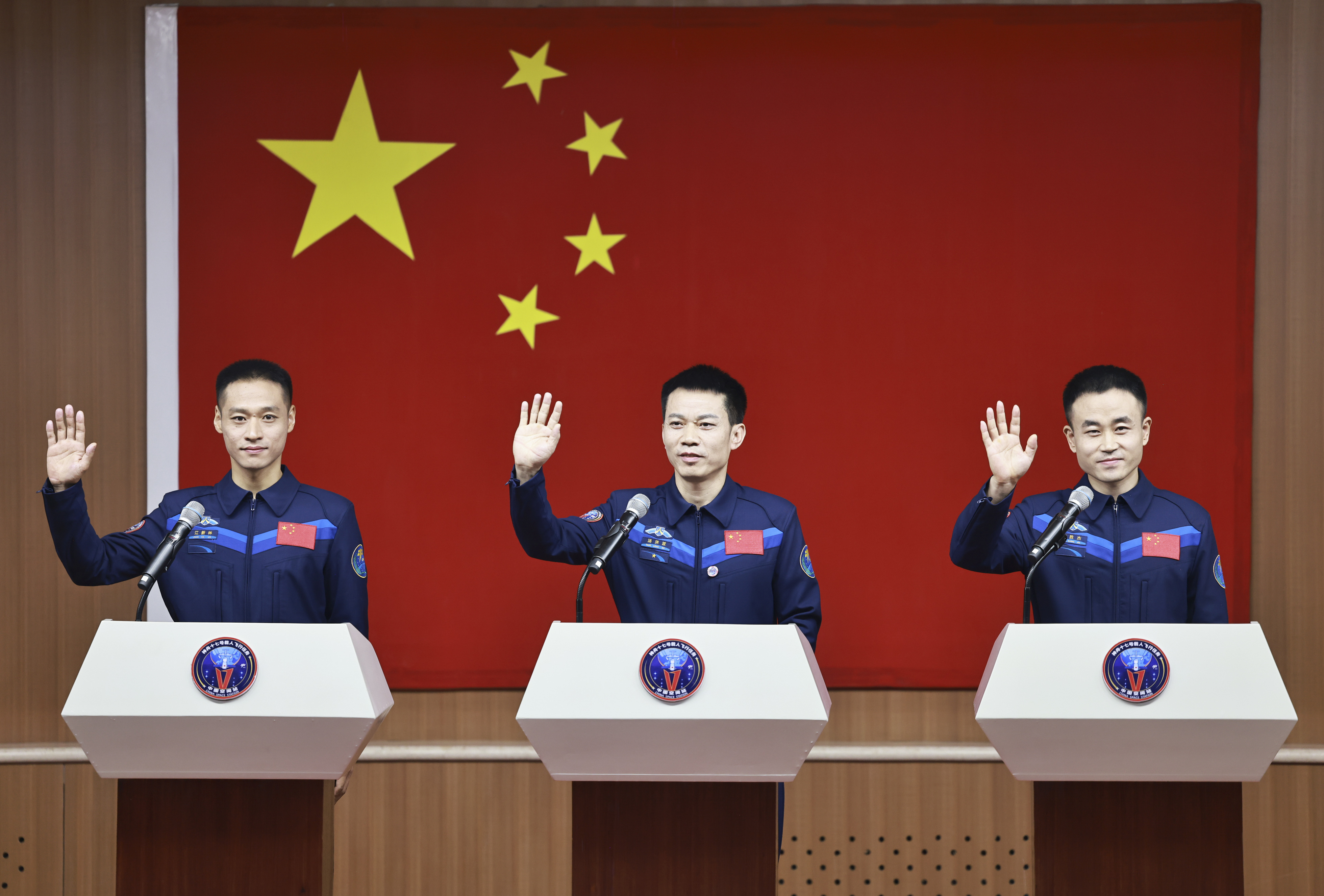 10月25日上午,神舟十七号载人飞行任务航天员汤洪波、唐胜杰、江新林在酒泉卫星发射中心问天阁与中外媒体记者集体见面。新华社记者 李刚 摄