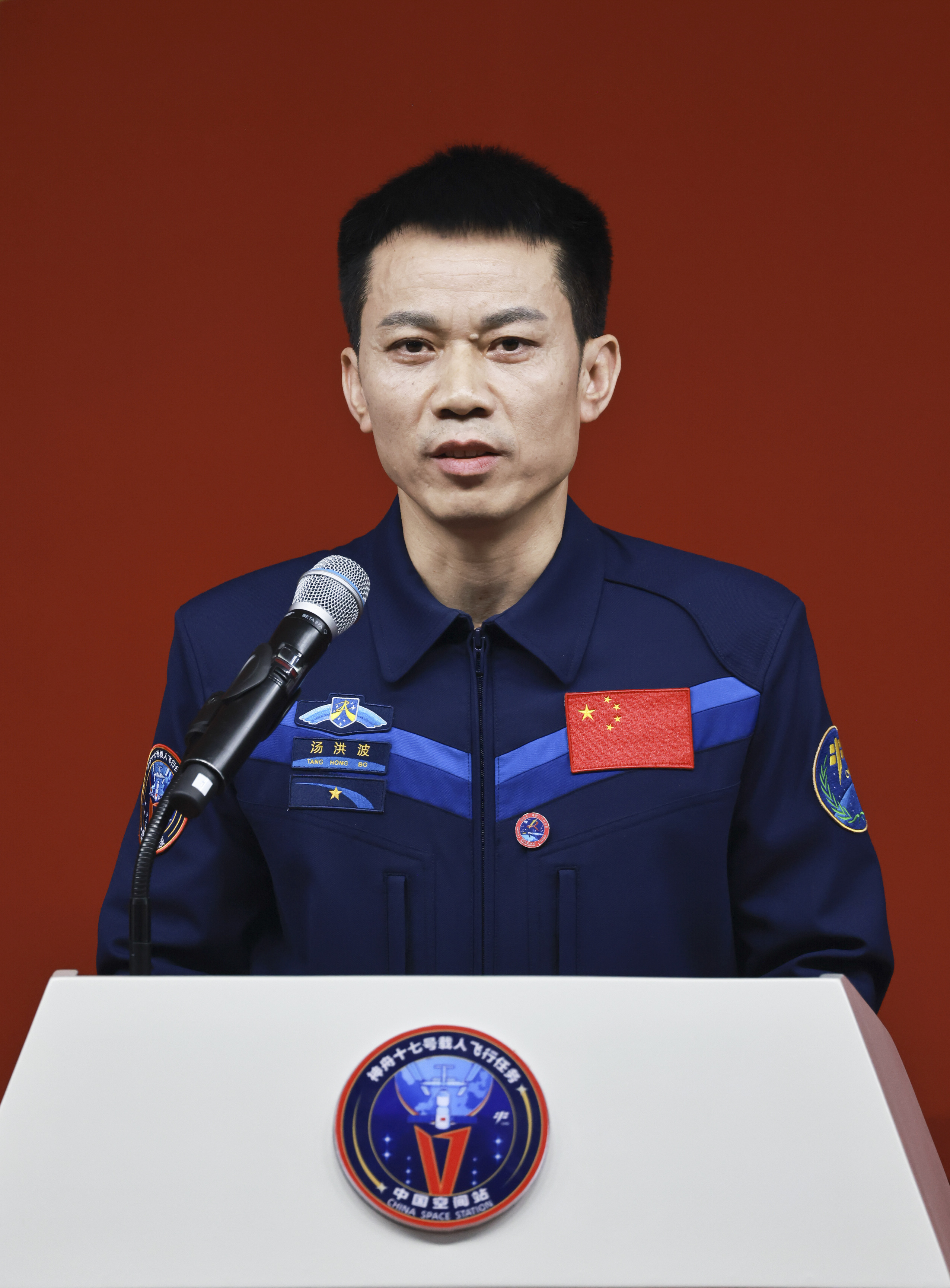 汤洪波,男,汉族,籍贯湖南湘潭,硕士学位。1975年10月出生,1995年9月入伍,1997年4月加入中国共产党,2010年5月入选为我国第二批航天员,现为中国人民解放军航天员大队一级航天员,陆军大校军衔。2021年6月执行神舟十二号载人飞行任务,同年11月被中共中央、国务院、中央军委授予“英雄航天员”荣誉称号,并获“三级航天功勋奖章”。经全面系统训练,科学合理、公平公正考核,成绩优秀,具备执行任务能力,入选神舟十七号载人飞行任务乘组并担任指令长。