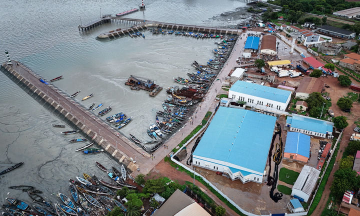 这是2024年7月8日在几内亚比绍首都比绍拍摄的板丁渔业码头和中企投建的水产品加工存储综合设施(右侧蓝顶建筑区域)(无人机照片)。新华社记者 韩旭 摄