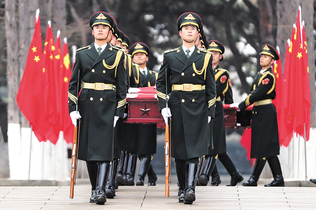11月29日,礼兵护送志愿军烈士遗骸棺椁进入安葬仪式现场。新华社发