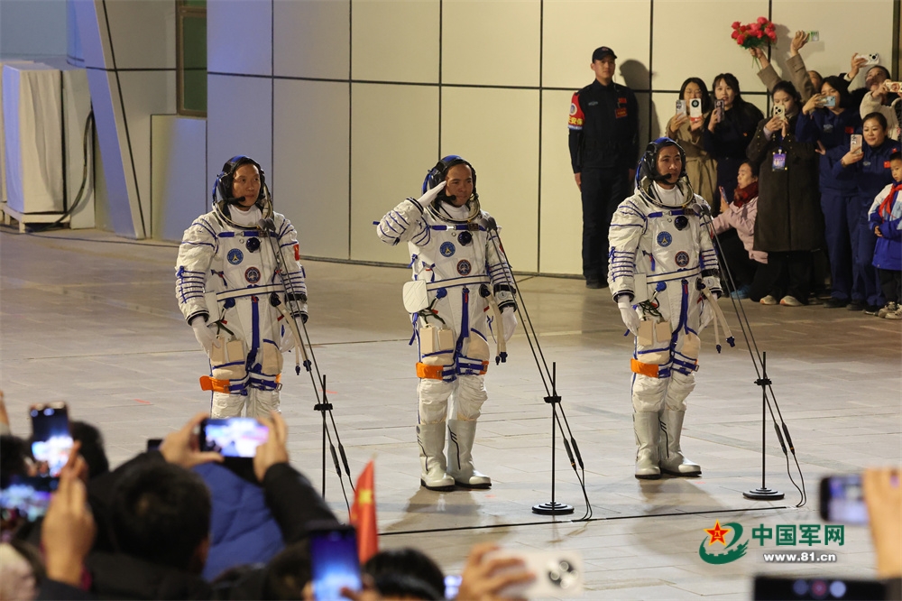 20时49分,张陆、武飞、张洪章3名航天员领命出征。空间站应用与发展阶段飞行任务总指挥部有关成员以及航天科技人员、各族群众代表在现场为航天员乘组壮行。