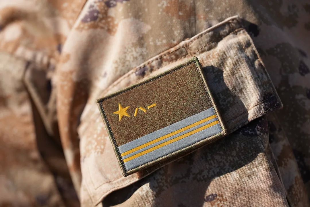 军旗臂章上半部保持解放军军旗旗面基本式样,下半部采用松枝绿镶嵌金黄色条,象征厚植保障根柢。