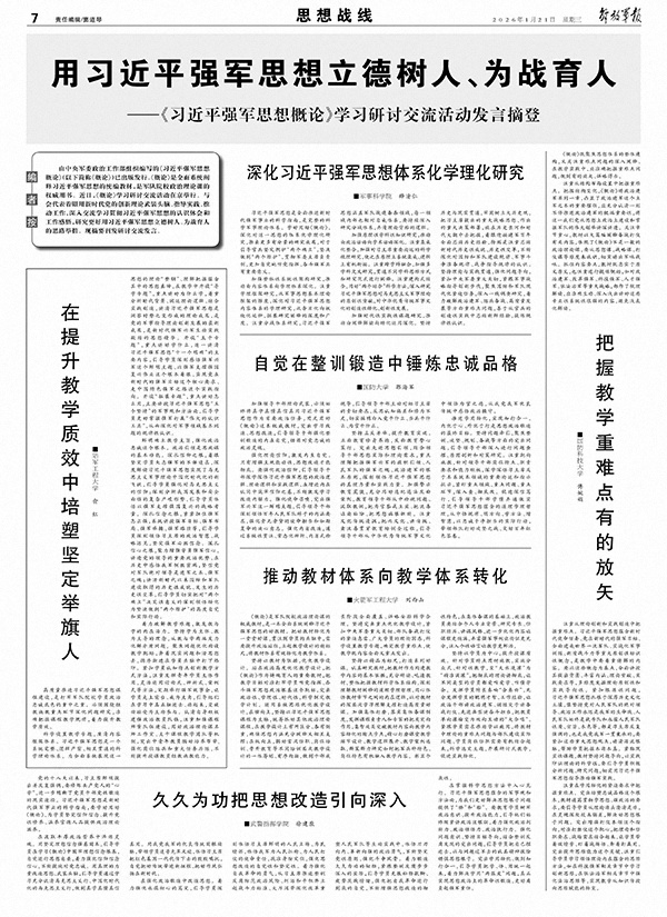 由中央军委政治工作部组织编写的《习近平强军思想概论》(以下简称《概论》)已出版发行。《概论》是全面系统阐释习近平强军思想的统编教材,是军队院校政治理论课的权威用书。近日,《概论》学习研讨交流活动在京举行。与会代表着眼用新时代党的创新理论武装头脑、指导实践、推动工作,深入交流学习贯彻习近平强军思想的认识体会和工作感悟,研究更好用习近平强军思想立德树人、为战育人的思路举措。现摘要刊发研讨交流发言。