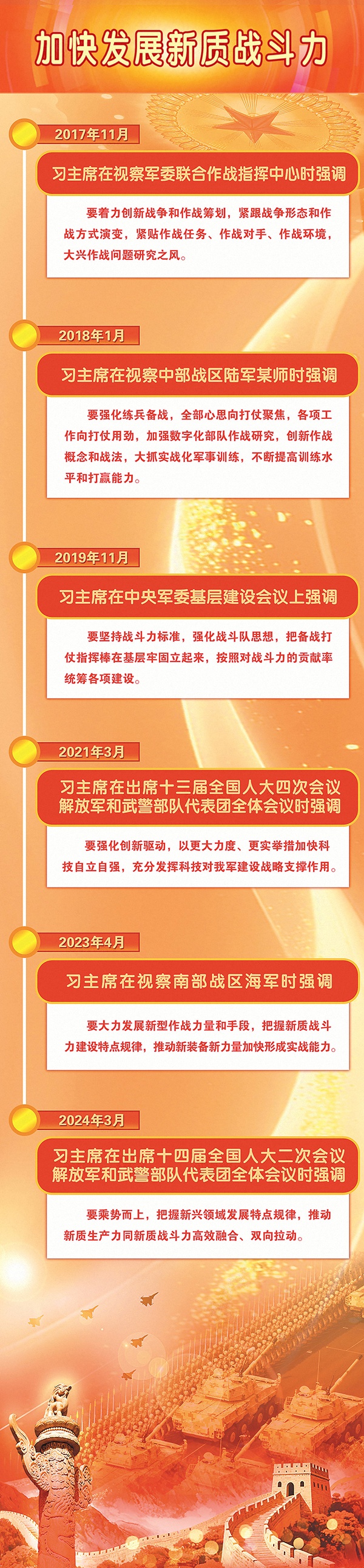 加快推进先进战斗力建设,既是高质量推进国防和军队现代化的题中应有之义,也是如期实现建军一百年奋斗目标的重要抓手。调整优化军事力量体系,加快新型作战力量发展,加大新型军事人才培养力度,扎实推进实战化军事训练,各项工作向能打仗、打胜仗聚焦,方能让战斗力要素的活力竞相迸发,推动先进战斗力建设不断迈上新台阶。