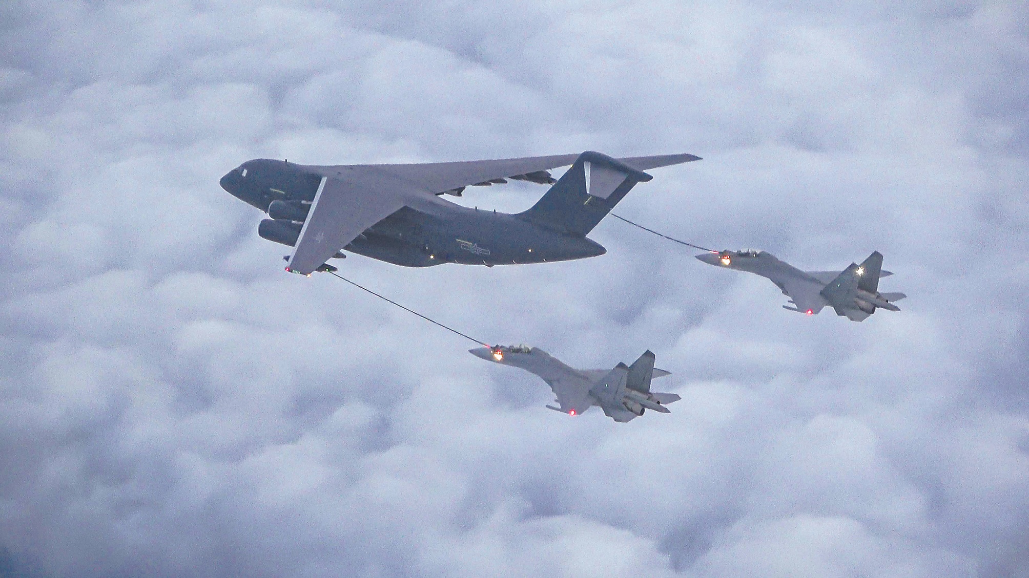 东部战区空军某部开展飞行训练,检验部队作战能力。图为空中加油。 熊伟 摄