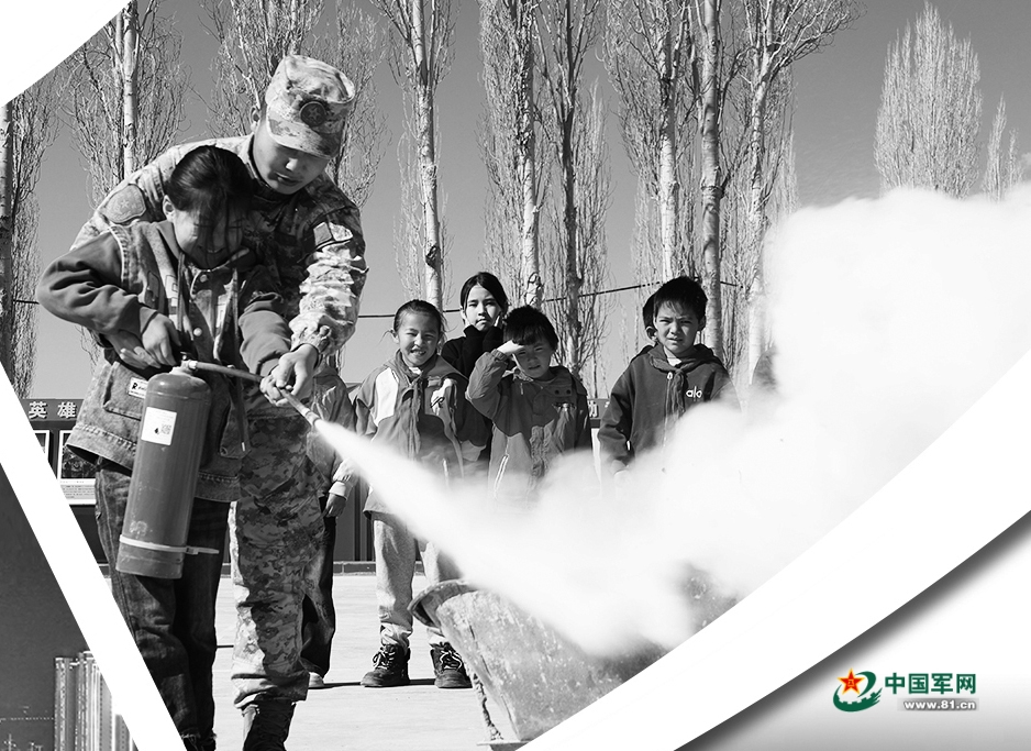 4月1日,新疆军区某边防团迈丹边防连官兵为国门小学学生演示灭火器的使用方法。白音那莫乐 摄